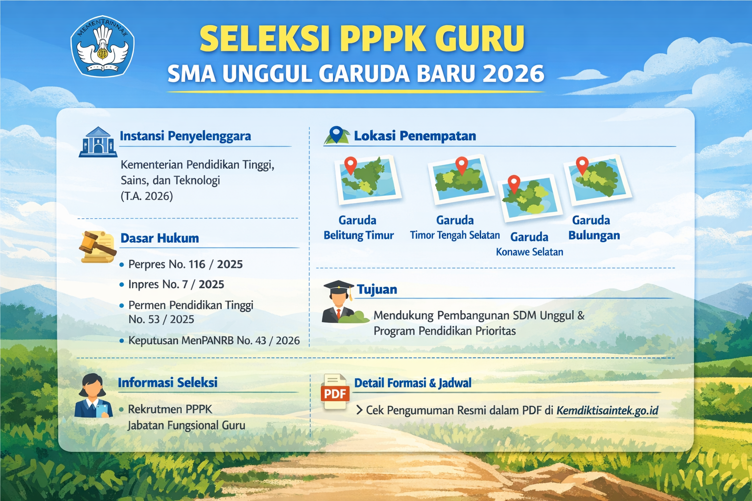 Pemerintah melalui Kementerian Pendidikan Tinggi, Sains, dan Teknologi membuka seleksi PPPK Guru untuk penempatan di SMA Unggul Garuda Baru.